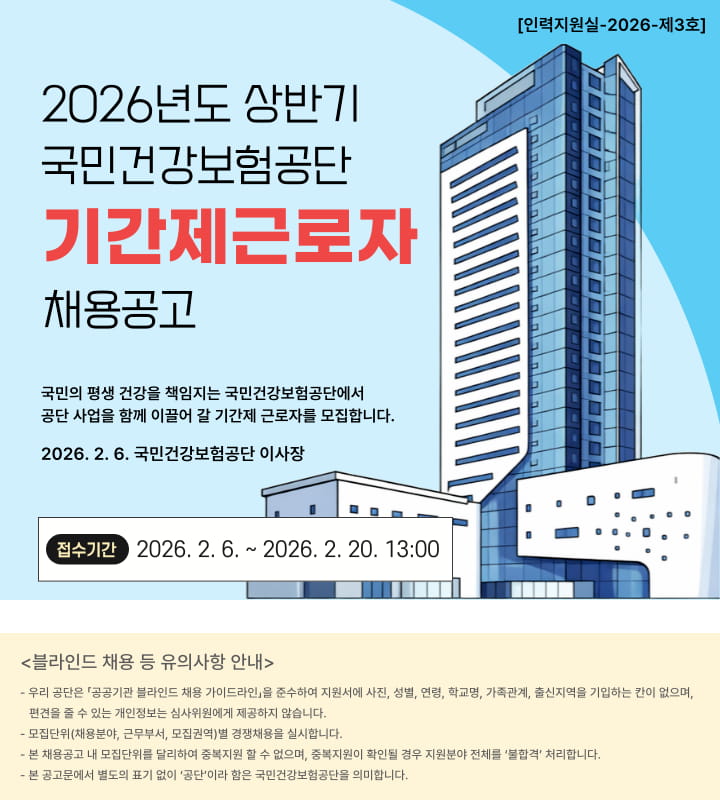 | Áö¿ø¼ Á¢¼ö | ¡¯26.2.6.(±Ý)¡2.20.(±Ý) 13:00 | °ø´Ü ȨÆäÀÌÁö(www.nhis.or.kr)>±¹¹Î¼ÒÅ롤Âü¿©>´º½º¡¤¼Ò½Ä>ä¿ë>°ø°í¹® È®ÀÎ>¿Â¶óÀÎ Á¢¼ö |